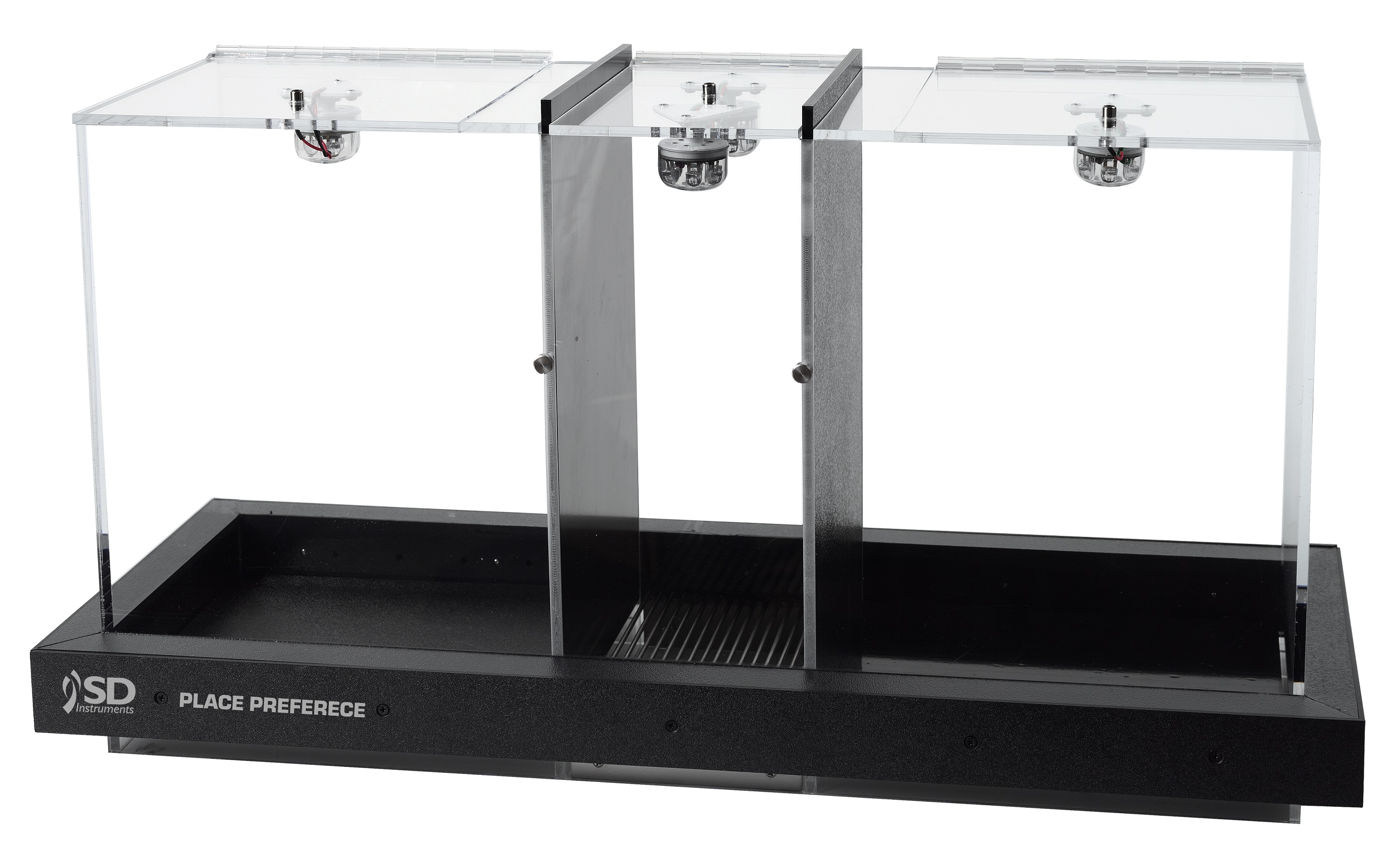 Maximum Flexibility with Cue Set Up Place Preference system overcomes the limitations of other systems that only offer fixed floors and black/white walled compartments. With SDI’s Place Preference, you may attach your own cues for each compartment separately and change them as needed due to its clear walls and option for either two or three compartment enclosures. Additionally, removable flooring makes it easy to design any flooring needed, and no-heat LED lights make for either a light or dark environment without worrying about heat affecting the animals.