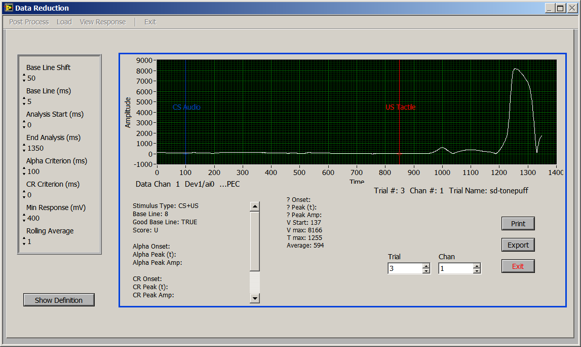 You will be able to define boundaries to identify alpha, CS and US responses and set the response amplitude threshold. After sessions are run, save any or all responses to composite secondary data files.
