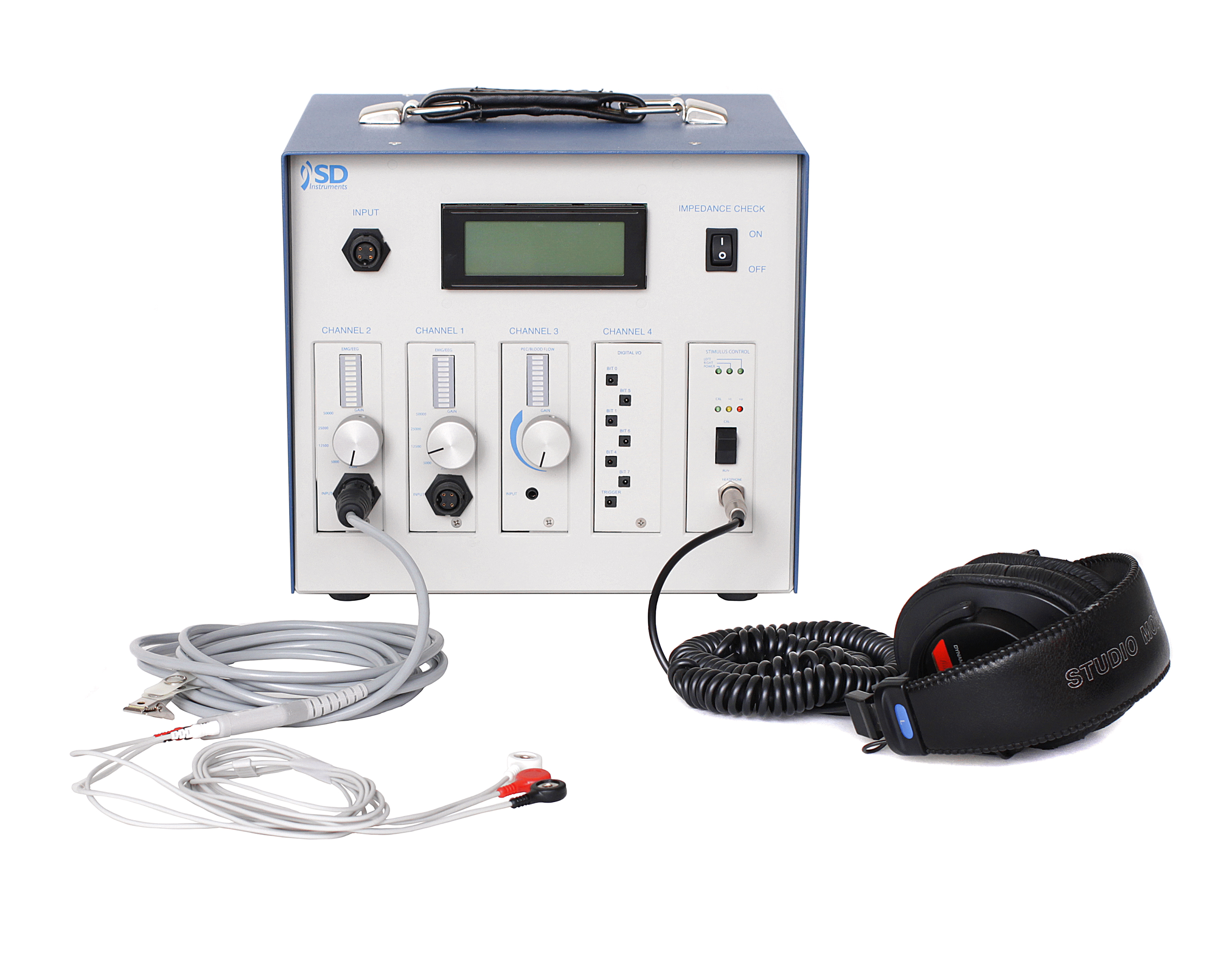 The basic system includes an integrated impedance meter (checks all electrode pairs at the same time), integrated control circuit with external connector to control 12 V devices, an auditory stimulus module (white noise, 1 KHz or 1.2 KHz) and a response module of the appropriate type for the sensor being used; EMG or PEC.