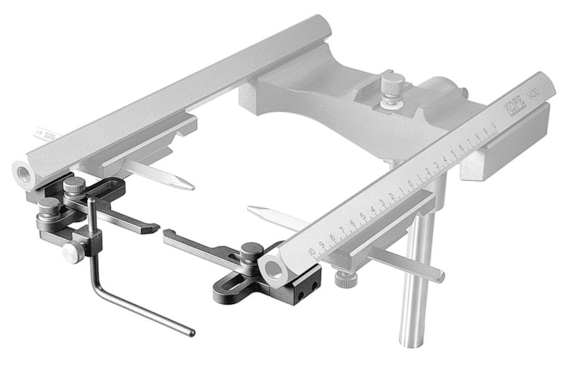 The animal is reversed 180° in the stereotaxic frame so that the head is facing the open end of the frame, thus allowing optical and facial access. This unit is mounted to the posterior portion of the frame bars. Design includes adjustable infraorbital eye bars located at the side of the animal’s head and adjustable palate clamp. Standard ear bars are used.