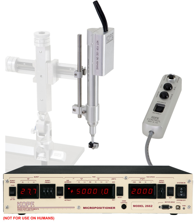 Model 2650-Z Hand Control with 10 foot cable provides absolute control of the microdrive. Hand Control with 25 foot cable can be provided upon request. A retract /advance rocker switch is utilized for directional positioning. Burst and run movement are controlled with individual pushbuttons. A reset button (recessed guard protection) is used for resetting the control panel display readout. We also offer Model 2650-Z-T Hand Control with spring loaded toggle run switch as an alternative to the standard pushbutton style run switch. Model 660-Y1 Probe Clamp Holder is included for easy attachment to any Kopf manipulator. Model 660-Y1-IN Insulated Probe Clamp can be supplied for electrically isolating the probe. Standard unit is a bench top set-up. A 6 foot power cord with applicable power plug is included. All Kopf 2600 series Micropositioners are FCC, Part 15 and CE approved.