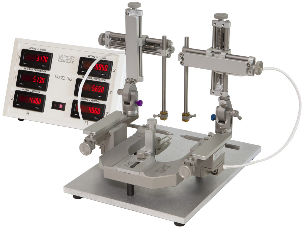 Model 942 Small Animal Stereotaxic Instrument with Digital Display Console combines the quality and accuracy incorporated in all Kopf stereotaxic instruments with state-of-the-art digital linear positioning scales for ease in operation.