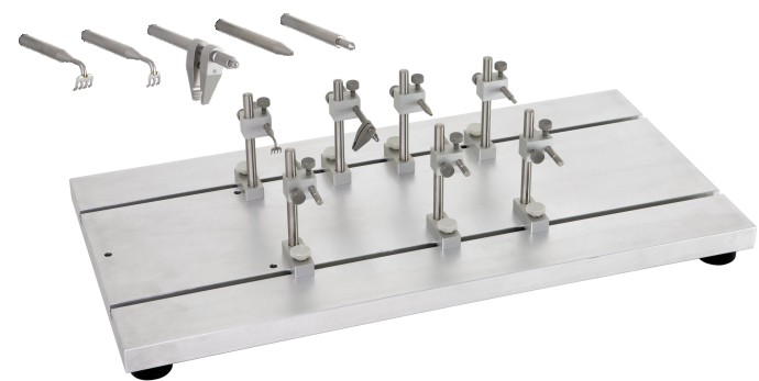 Attached to the plate by way of tee slots are seven base mounts with vertical posts and clamps. The mounts are secured to the base plate by thumb screws and tee nuts for fast, rigid clamping. No wrenches are needed.